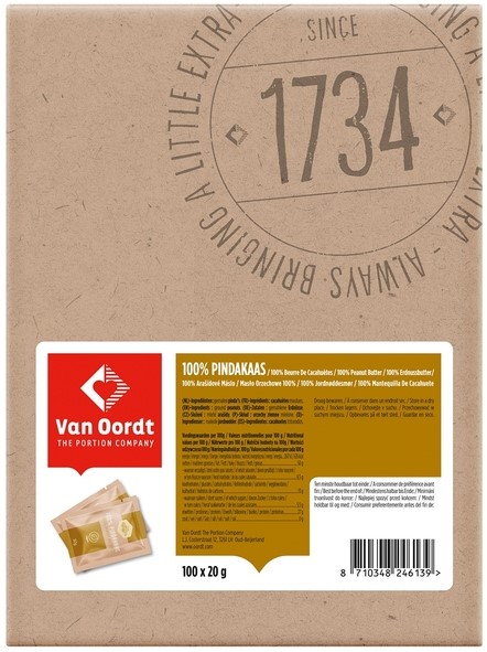 • Verpakt in praktische en hygiënische eenpersoons zakjes. Éen zakje bevat 20 gram pindakaas. Leverbaar in een omdoos à 100 stuks.