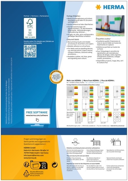 Gekleurde etiketten op A4-vellen, zelfklevend, etiketformaat 70x37mm blauw permanent hechtend, 100 vel per verpakking. Ideaal voor het labelen met signaalfunctie, bijv. waarschuwingsstickers, spoedaantekeningen, adreswijzigingen, kleurcodering, acties. Milieuvriendelijk: FSC® Mix Credit-gecertificeerd, chloorvrij gebleekt, oplosmiddelvrije contactlijm. Etiketten zijn 100 % recyclebaar via het oud papier, verpakking van gerecycled karton. Zeer goede drukresultaten op alle laser- en inkjetprinters, kopieerapparaten, kleurenlaserprinters en kleurenkopieerapparaten. Storingvrije verwerking dankzij veiligheidsrand rondom en optimale vlakligging. Gratis softwareoplossingen: www.herma.com/software.