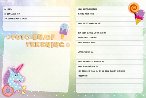 • Laat je vriendjes en vriendinnetjes in dit leuke Unicorn vriendenboek schrijven. Ontdek leuke verhalen en grappige weetjes over ze. Wanneer zijn ze jarig en wat willen ze later worden? Wat is hun lievelingsdier en waar houden ze totaal niet van? Al je vriendjes en vriendinnetjes kunnen een mooie foto van zichzelf in dit vriendenboek plakken of een mooie tekening maken. Bewaar je herinneringen voor altijd! Wie laat jij in jouw vriendenboek schrijven?