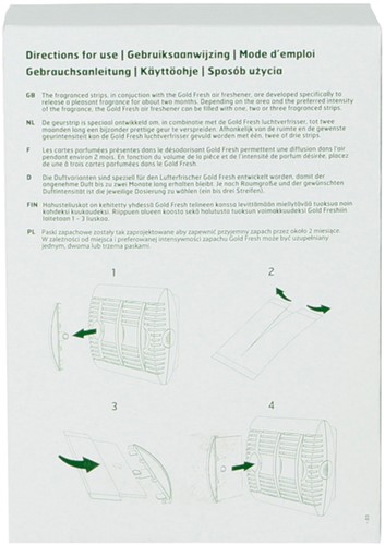 • Deze luchtverfrisser is speciaal ontwikkeld om, in combinatie met de geurstrips, tot twee maanden lang een bijzonder prettige geur te verspreiden. Afhankelijk van de ruimte en de gewenste geurintensiteit kan de Gold Fresh luchtverfrisser gevuld worden met één, twee of drie strips.