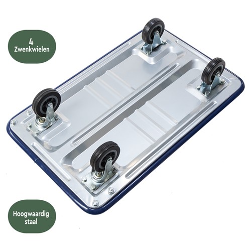 • Deze transport dolly, ook wel meubelhond(je) genoemd, is gemaakt van een hoogwaardig en duurzaam stalen frame en heeft een draagkracht van 300 kilo. Het stalen frame zorgt ervoor dat het frame tegen een stootje kan en daarmee een lange levensduur heeft. Daarnaast is deze handige verplaatser afgewerkt met een rubberen antislip laag op de bovenzijde. Deze antislip laag zorgt ervoor dat de lading op de transportwagen niet verplaatst tijdens het transport. De dolly beschikt over 2 zwenkwielen. Hierdoor manoeuvreer je de transportwagen eenvoudig en snel naar de plek die jij wilt. Het artikel kan met schroefassemblage in elkaar worden gezet zodat het jou kan helpen bij de zware klussen. Draagvermogen: 300kg.