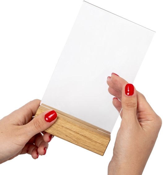 • Presenteer jouw menu’s, acties of mededelingen stijlvol met de IEZZY menukaarthouder T tafeldisplay A5. Deze fraai vormgegeven display combineert een transparante plastic houder met een stevige eikenhouten voet, wat zorgt voor een professionele en natuurlijke uitstraling. Dankzij het praktische ontwerp plaats je documenten moeiteloos vanaf de zijkant, ideaal voor snel wisselende informatie in horecagelegenheden, hotels, kantines of winkels. Het A5-formaat is compact en toch opvallend genoeg om de aandacht te trekken zonder veel ruimte in beslag te nemen. Een betrouwbare keuze voor iedereen die presentatie en uitstraling belangrijk vindt. Kenmerken: