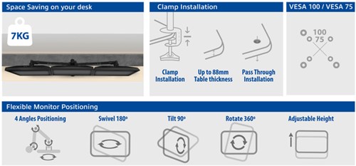 • Dankzij het handige beeldschermmontagesysteem kun je alle drie de monitoren zelf op de steun bevestigen. De bureausteun wordt compleet geleverd met alle montagemiddelen voor zowel klem- als doorvoermontage.