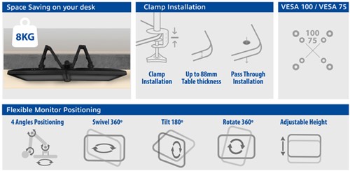 • De AC8302 is uitgerust met VESA aansluitingen van 75x75 mm en 100x100 mm. Dankzij het handige montagesysteem monteer je eenvoudig zelf de beeldschermen zonder hulp van anderen. De bureausteun wordt compleet geleverd met alle montagemiddelen voor zowel klem- alsook doorvoermontage.