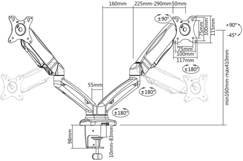 • Dubbele bureausteun, eenvoudig in hoogte verstelbaar zonder gereedschap door het handige gasveersysteem.