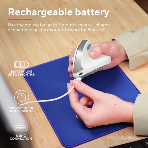 • Ergonomische draadloze muis met optimale verticale hoek die belasting van pols vermindert.