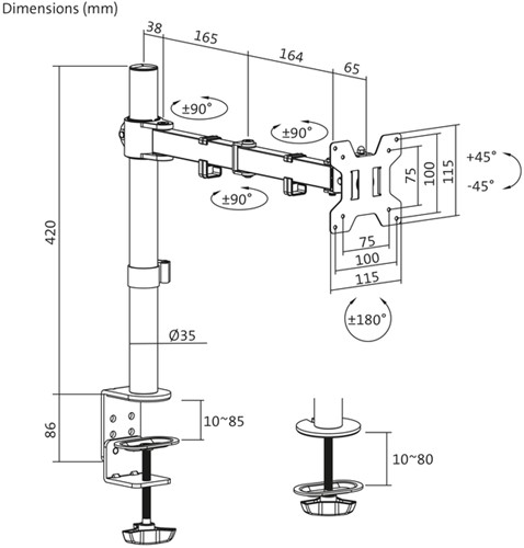 • Ontwerp uw werkplek met de Quantore monitorarm, perfect voor schermen van 17" tot 27". Vervaardigd uit een combinatie van staal, aluminium en kunststof, en afgewerkt met een poedercoating in matzwart, biedt deze monitorarm een stijlvolle en stevige oplossing voor uw beeldschermbehoeften. De arm is geschikt voor een gewicht tot 10 kg en ondersteunt VESA-maten van 75x75 en 100x100, wat zorgt voor brede compatibiliteit met de meeste monitoren. De volledig verstelbare structuur biedt een kantelbereik van +45° tot -45°, een zwenkbereik van +90° tot -90°, en een volledige schermomwenteling van +180° tot -180°, waardoor u uw scherm moeiteloos kunt positioneren voor de beste kijkervaring. De monitorarm kan zowel via een klem- als een tulebevestiging worden geïnstalleerd, geschikt voor bureaubladdiktes van 10 tot 85 mm (klem) en 10 tot 80 mm (tule), waardoor deze arm zeer flexibel inzetbaar is op verschillende werkplekken. Met de geïntegreerde kabelclips blijft uw werkruimte netjes en georganiseerd, vrij van rondhangende kabels. Kies voor de Quantore monitorarm om comfort en functionaliteit aan uw werkplek toe te voegen, terwijl u ook de fysieke belasting tijdens lange werkdagen vermindert. Kenmerken: