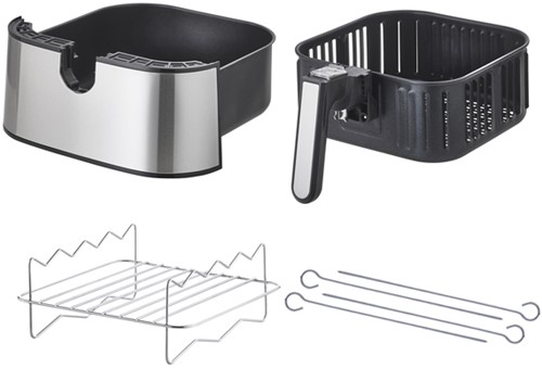• Zonder extra olie of vet toch heerlijke frites en snacks bakken met een lekker, knapperig korstje? Dat kan met de Inventum airfryer GF500HLD! Omdat je met hetelucht frituurt heet het apparaat ook wel hetelucht friteuse. Je kunt met deze airfryer behalve frituren ook grillen, roosteren en bakken. In deze hetelucht friteuse met 5 liter inhoud kun je per keer maximaal 1500 gram frites bakken. De optimale hoeveelheid is 1000 gram. Het apparaat is eenvoudig te bedienen met tiptoetsen. Kies op het digitale display 1 van de 8 automatische programma's of stel zelf de temperatuur en de baktijd in. Tijdens het bakken kun je de resterende tijd zien op het display. Deze airfryer is gemakkelijk schoon te maken. Je kunt de pan en de frituurmand met anti-aanbaklaag gewoon in de vaatwasser zetten.