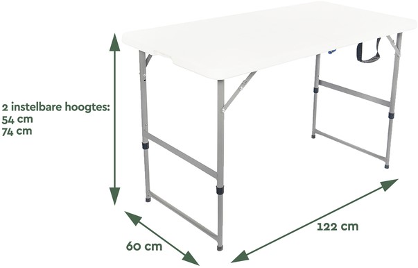 • Betrouwbaar, compact en lichtgewicht: De vouwtafel heeft een afmeting van 120x60x74 (lxbxh) en heeft 2 instelbare hoogtes, zo stel je hem eenvoudig in op 54 en 74 cm hoogte. Perfect voor zowel kleine appartementen als grotere evenementenruimtes. Hij heeft een sterk stalen frame met buizen met een doorsnede van 25mm. Door het lichtgewicht honingraat design weegt de vouwtafel slechts 8,5 kg. Deze inklapbare tafel is gemaakt uit robuuste materialen wat zorgt voor een kwalitatief product, en is daarom zowel binnen als buiten te gebruiken. Dit komt de maximale draaglast ten goede (max 80kg). De opvouwbare tafel is gemaakt van HDPE kunststof en bevat gerecyclede materialen. Mede hierdoor heeft het blad van de tafel een gemêleerde witte kleur (deze is dus niet effen wit).