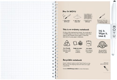 • Ooit op steenpapier geschreven? Dit is je kans! Met onze lokaal geproduceerde MOYUs kun je elke pagina maar liefst 500 keer uitwissen. Je schrijft met de bijgeleverde MOYU Frixion pen en wist de inkt met een simpele "wipe" uit door het bijgeleverde doekje vochtig te maken.