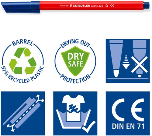 • Dry - safe inkt - kan dagenlang open liggen zonder uitdrogen (test ISO 554).
