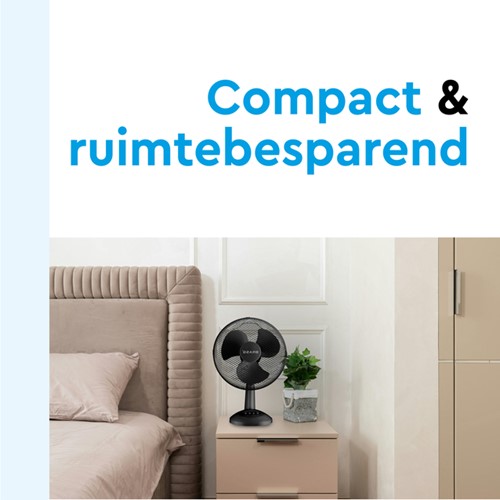 • Compact en ruimtebesparend. Dankzij het handzame formaat van 16,5x34,5x37 cm van de waaier en het lichte gewicht van slechts 1,6 kg is deze ventilator overal inzetbaar. Gebruik hem als bureauventilator voor een verfrissende luchtstroom tijdens het werken, plaats hem op je nachtkastje voor een koele nachtrust of gebruik hem in de woonkamer zonder dat hij veel ruimte inneemt. Ondanks zijn compacte formaat levert hij met zijn 40 Watt krachtige prestaties!