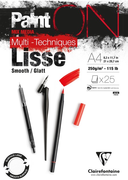 PaintON wit glad blok A5 25bl 250g. Ideaal voor tekenen of schilderen. Een glad multitechniek tekenpapier, goed voor droge techniek en natte techniek zoals viltstift, Chinese inkt, plakkaatverf of acryl. Goed bestand tegen het krassen en verdraagt verschillende lagen zodat corrigeren mogelijk is (uitvegen van een geschilderde lijn)
