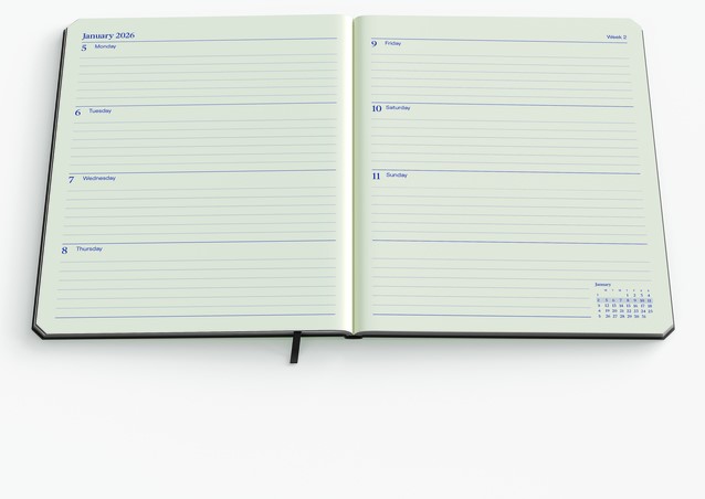 de KEMPEN planner Weekly Planner eentalig Engels met 1 week per 2 pagina's. Boekgebonden agenda met chamois papier, schuine hoekjes, kleur op snee en een leeslint, volledig vlakliggend, in een aangename en soepele PU omslag op formaat 17 x 22 cm. De kleuren worden in willekeur uitgeleverd.