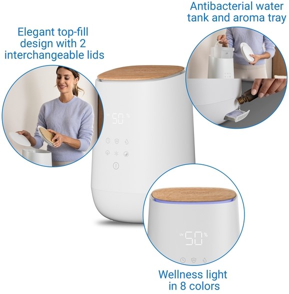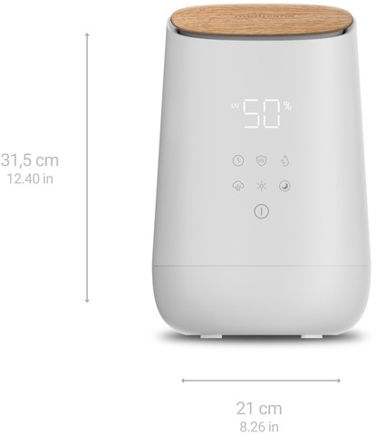 • De lucht in de ruimte wordt efficiënt bevochtigd met ultrasone technologie, terwijl het geïntegreerde UV-C licht ziektekiemen en bacteriën in het water vermindert. Het LED-display met aanraakbediening kan worden gebruikt om de luchtvochtigheid individueel in te stellen tussen 45%-75% en de bevochtigingsintensiteit in drie fasen. Een geïntegreerde sensor controleert constant de luchtkwaliteit en past automatisch het geselecteerde vochtigheidsniveau aan.