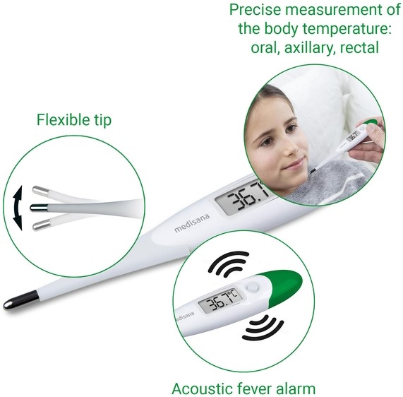 • Meten kan oraal, rectaal of onder de oksel, in °C of in °F en is dankzij de flexibele punt een stuk prettiger in gebruik. Bij de start en het einde van iedere meting geeft de TM 700 een signaal, en na 10 minuten schakelt deze zichzelf weer uit. Gebruiksvriendelijkheid die kenmerkend is voor Medisana producten en tevens de batterij spaart. Zo weet u zeker dat u kunt meten die enkele keer per jaar dat u een thermometer nodig heeft.