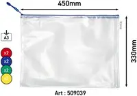 • Versterkte transparante opbergtassen van A3-formaat met ritssluiting.