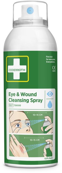 • Spray om stof en vuil uit de ogen en wonden weg te spoelen en deze te reinigen. De spray geeft een milde stroom water, met een totale spoeltijd van 5 minuten. De spray werkt in elke hoek en in iedere richting. De spray kan verscheidene keren worden gebruikt en blijft tot de allerlaatste druppel steriel. Bevat 150 ml steriele natriumchlorideoplossing, 0,9 % NaCl. Ecovriendelijk drijfgas. Past in het eerstehulpstation. Houdbaarheidsperiode 5 jaar.