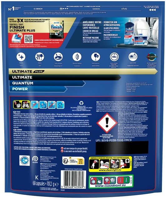 • Met Finish Quantum regular all in one vaatwascapsules krijg je bij elke wasbeurt vanaf de eerste keer een diepe reiniging en een stralende glans! De capsuletechnologie met drie compartimenten verwijdert alle soorten voedselresten - zonder dat je je vaat hoeft voor te spoelen. Het poeder en de gel werken om residu los te maken en te verwijderen. De Powerball beschermt het glas en helpt de glans van je servies te behouden. Dit alles met 25% minder chemicaliën dan onze klassieke Finish compacte poedertabletten.