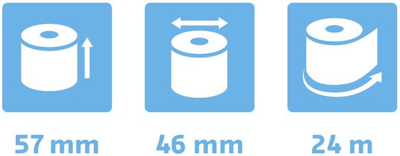 • Afmetingen rol: breedte 57mm, diameter 46mm, lengte (+/- 2m) 24m.