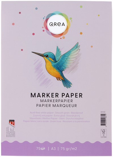 • Markerblok Qrea A3 – 75 vel Het Qrea markerblok in A3-formaat is ideaal voor grotere schetsen, illustraties en markerwerk. Met 75 vellen (150 pagina's) van 75 grams optisch wit papier biedt dit blok alle ruimte voor creativiteit. Het papier is dun genoeg om onderliggende schetsen of hulplijnen te blijven zien, maar voorkomt effectief dat inkt doorlekt naar de achterkant of onderliggende pagina's. De kleuren lopen niet uit of waaieren niet, waardoor strakke lijnen en gedetailleerde vlakken eenvoudig te realiseren zijn. Ook bij het aanbrengen van meerdere lagen ontstaan vloeiende kleurovergangen. Perfect geschikt voor gebruik met Copic-, Letraset-, Edding- en andere markers op alcohol- of oplosmiddelbasis. FSC-gecertificeerd en geproduceerd in Duitsland. Kenmerken: