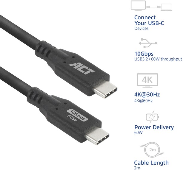 • Data, power en video via één USB-C-kabel. De AC7442 USB-C-kabel kan overweg met zowel data, power en video. De kabel ondersteunt de USB 3.2 technologie en voor een maximale overdrachtssnelheid tot 10Gbps.
