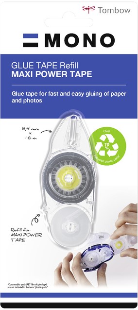 • De MONO maxi power tape is een navulbare lijmtape voor eenvoudig, snel en rimpelvrij lijmen. Met extra sterke, permanente lijm en een extra lange tape van 16 meter. Dankzij de unieke technologie wordt de lijm altijd exact op de punt van de roller aangebracht – voor nauwkeurig lijmen van randen en hoeken. De MONO maxi power tape is perfect voor sterk en schoon lijmen van papier, karton, foto’s en meer. Zuurvrij en fotoveilig. Voorzien van een beschermkap. Behuizing gemaakt van 100% gerecycled plastic (PN-IP). Bekroond met de iF Product Design Award 2015. Eenvoudig navulbaar. Tape: 8.4mmx16m. Navulling: PR-IP (kunststof onderdelen gemaakt van meer dan 70% gerecycled materiaal).