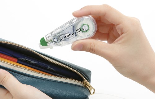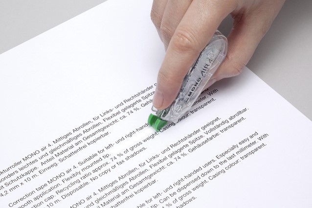 • De correctietape MONO air4 garandeert een moeiteloos lichte en stille correctie tot de laatste millimeter. Air Touch Technology zorgt voor een soepele en stille toepassing. De tape hecht goed op papier en laat niet gemakkelijk los, zelfs niet bij overschrijven met fijne balpennen. Een geïntegreerde uitschuifbare dop beschermt de tape tijdens het opbergen en tevens de flexibel gemonteerde tip. Ondanks de tape van 10 meter heeft hij een compact formaat en past hij in kleine zakken en etuis. Geschikt voor zowel links- als rechtshandigen. Geen droogtijd, direct en schoon overschrijfbaar. Uitzonderlijke dekkracht, geen kopie- of faxschaduwen. Behuizing gemaakt van 100% gerecycled plastic.