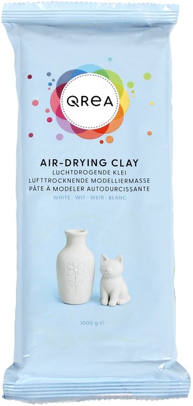 • Luchtdrogende klei Qrea wit – 1000 gram Ontdek de veelzijdigheid van Qrea luchtdrogende klei, ideaal voor creatieve projecten zonder oven! Deze witte klei is gemaakt van natuurlijke grondstoffen en is zowel glutenvrij als vegan. De klei hardt vanzelf uit door blootstelling aan lucht, waardoor bakken overbodig is. Dankzij de fijne structuur plakt hij niet aan de handen, vlekt niet en laat zich eenvoudig uit kleding wassen. De klei hecht goed op vrijwel elke ondergrond en is na droging overschilderbaar. Iets ingedroogd materiaal kun je weer soepel maken met een beetje water. Voor een duurzaam resultaat kun je het eindwerk aflakken met vernis. Kenmerken: