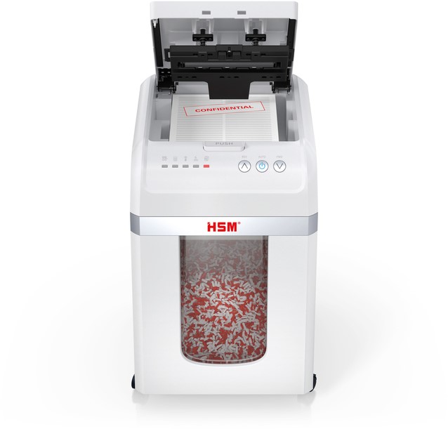 • De datavernietiger met automatische invoer versnippert tot 300 vellen in snippers in veiligheidsniveau P-4 (4x12mm), wat zorgt voor AVG/GDPR-conforme gegevensbeveiliging.