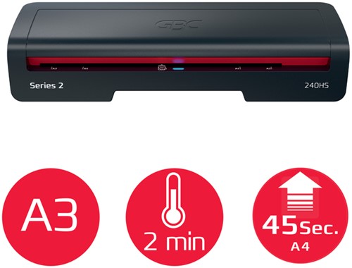 • De GBC 240HS is een slanke en efficiënte oplossing voor je alledaagse lamineerbehoeften. Deze HighSpeed A3 lamineermachine is ontworpen met het oog op zowel stijl als prestaties en is ideaal voor gebruik thuis of op kantoor aan huis. Verhoog de productiviteit en verkort de lamineertijd met 33% met GBC HighSpeed lamineerhoezen. Met een snelle opwarmtijd van 2 minuten lamineert hij een A4 vel van 75 micron in slechts 45 seconden, waardoor hij perfect is voor het efficiënt afhandelen van je thuisprojecten. De gebruiksvriendelijke bedieningsschakelaar biedt drie instellingen voor lamineerhoesdikte van 75-125 micron, wat flexibiliteit biedt voor verschillende soorten documenten. Een anti-vastloop ontgrendelingshendel zorgt voor een soepele werking door het moeiteloos verwijderen van verkeerd geplaatste lamineerhoezen. Bovendien vereenvoudigt het SMART status ledsysteem de bediening met duidelijke visuele en auditieve signalen: rood tijdens het opwarmen, blauw met een geluid wanneer de machine klaar is en een automatische uitschakeling na 15 minuten inactiviteit om energie te besparen. Bescherm en bewaar je belangrijke documenten met een perfecte afwerking, elke keer weer.