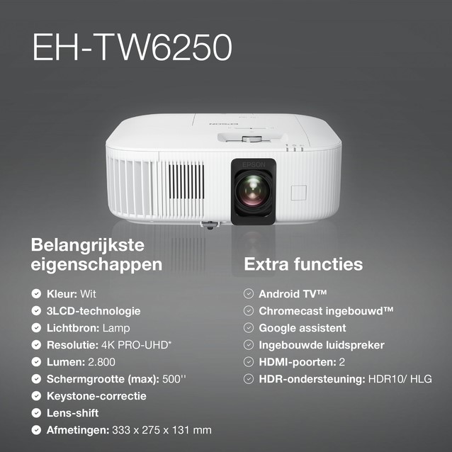 • Geniet van het unieke bioscoopgevoel: Projecteer uw favoriete games, films en sportevenementen thuis in supergroot formaat Makkelijk te installeren: x1,6 zoom, horizontale en verticale keystone-correctie Duurzame oplossing: Geniet 15 jaar lang van vlijmscherp entertainment (Gebaseerd op het dagelijks bekijken van een film met een gemiddelde duur van 1 uur en 45 minuten, met de lamp ingesteld op Eco-modus) Indrukwekkend heldere weergave: Een even hoog lichtrendement van wit en gekleurd licht van 2800 lumen.