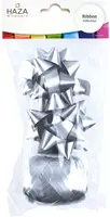Setje van één polyband eitje, en twee rozetten. Afmeting eitje: 5mmx20m. Afmeting rozetten: 15mm lint, Ø75mm. Kleur: zilver.