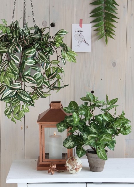 Klaar om zorgeloos te genieten van groen in je huis? De kunstplanten van Mica Decorations zijn niet van echte planten te onderscheiden, maar vereisen helemaal geen verzorging. De Syngonium, oorspronkelijk afkomstig uit de tropische regenwouden, brengt nu een exotisch accent naar jouw woonkamer! De stervormige, groene bladeren hebben een subtiele lichter kleur rondom de nerven en zijn bevestigd aan realistische, bruine takjes. De plant is al in model gebracht en stevig geplaatst in een terracotta pot met basaltgrijze tinten. Na aankoop kun je de plant direct neerzetten, of geef hem een extra flair door hem in een mooie overpot te plaatsen. Combineer de Syngonium met andere kunstplanten en -bloemen uit de collectie en vul je interieur met groen. De plant heeft een hoogte van 35 cm en een diameter van 25 cm.