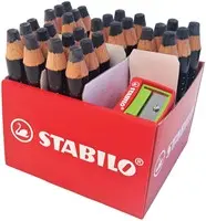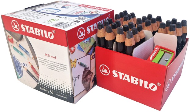 • en kan makkelijk worden gewist met een droge of natte doek. Net zo gemakkelijk in gebruik als een krijtje. Danzij de stevige droge kern droogt deze marker nooit uit en garandeert een egale constante kleurafgifte tot de laatste streek. De kleur trekt niet in het papier en drukt niet door. De marker is oplosmiddelvrij, geurloos en gemaakt van 100% PEFC-gecertificeerd hout. Het perfecte alternatief voor gangbare inktmarkers. STABILO MARKdry Classpack met 30 zwarte potloden.