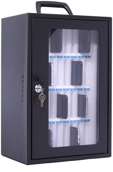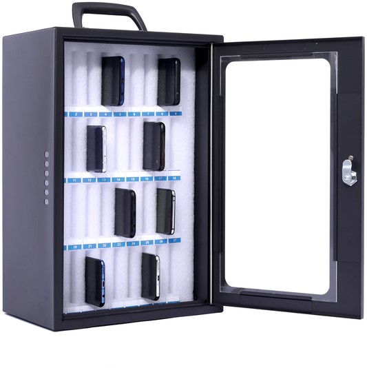 • De Pavo-smartphonekluis is een efficiënte en veilige opslagoplossing die perfect is voor het opbergen van mobiele telefoons in onderwijsinstellingen, sportclubs en andere organisaties. Deze opbergkast van staal met een acryldeur is ontworpen om tot 36 smartphones op een georganiseerde en krasvrije manier op te bergen. Elk apparaat krijgt zijn eigen plek in zachte schuimcompartimenten die optimale bescherming bieden en individueel genummerd zijn, zodat gebruikers hun telefoons snel en gemakkelijk kunnen terugvinden. De kluis is beveiligd met een sleutelslot, waardoor een veilige opslag tijdens lessen of trainingen wordt gegarandeerd. Hij kan worden gebruikt als draagbare optie, omdat hij is uitgerust met een handvat, of aan de muur worden bevestigd voor extra veiligheid en ruimtebesparing. De kluis is zeer geschikt voor het tijdelijk opbergen van smartphones op scholen, (sport)clubs, klinieken en andere plaatsen waar telefoons niet zijn toegestaan.