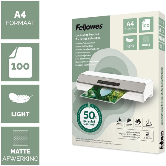 Geef je documenten een nette, professionele uitstraling met deze A4 lamineerhoezen, ontworpen voor dagelijks gebruik en duurzame prestaties. Gemaakt van 50% gerecycled materiaal (minimaal 35% post-consumer, 15% pre-consumer) bieden ze betrouwbare bescherming en ondersteunen ze milieubewuste keuzes. De hoogwaardige matte afwerking zorgt voor veelzijdigheid en visuele aantrekkingskracht, ideaal voor een breed scala aan lamineertaken. Ontworpen voor gebruik op een instelling van 70/80 micron bevat elke hoes een antistatische toevoeging voor soepel en probleemloos gebruik. Verpakt in papiergebaseerde materialen uit duurzame bronnen, inclusief de hoesdrager, tape en buitenverpakking, is deze set van 100 hoezen een slimme keuze voor zowel thuis als op kantoor.