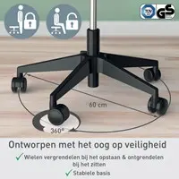 • Lichtgewicht en verrijdbaar met 5x 360° lichtlopende zwenkwieltjes die de veiligheid verhogen door de weerstand te verhogen wanneer de kruk niet in gebruik is, waardoor onbedoelde beweging wordt voorkomen, geschikt voor alle vloertypen op kantoor en thuis.