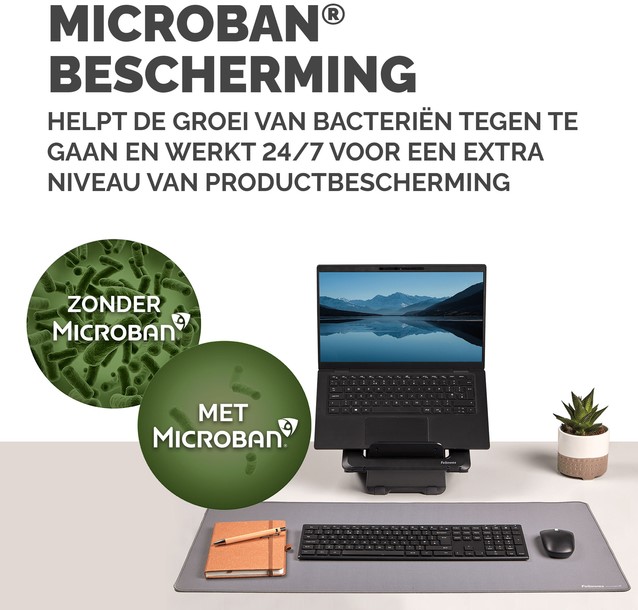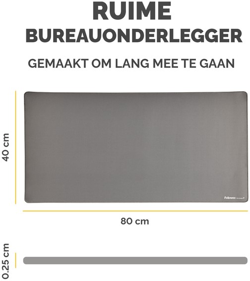 Ruime bureaumat beschermt tegen vuil en krassen en zorgt voor een niet-reflecterend werkoppervlak. Biedt een comfortabel oppervlak om te schrijven en te typen en verbetert de prestaties van de muis. Ingebouwde Microban®-bescherming helpt de groei van bacteriën te voorkomen en werkt 24/7 voor een extra niveau van productbescherming. Gemaakt van 83% gerecycled materiaal. Antislip onderkant houdt de mat de hele dag op zijn plaats. Duurzame platte stiksels voorkomen rafelen. Gemaakt om lang mee te gaan, met 5 jaar garantie.