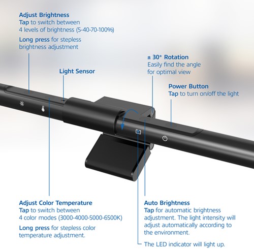 • Automatische helderheid. De monitor ledlamp heeft een automatische helderheid-functie die zich aan het omgevingslicht aanpast. De lamp levert zelf de juiste hoeveelheid licht. Wil je dit toch liever zelf bepalen? Dan zet je deze functie heel gemakkelijk zelf uit.