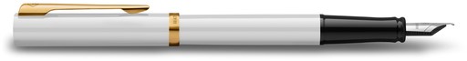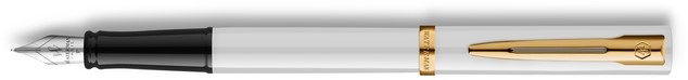 • Maak indruk met Waterman Impression, waar verfijnd Frans vakmanschap en zelfverzekerde elegantie samenkomen. De slanke huls en dop, afgewerkt met glanzende witte lak, komen samen om een elegante en blijvende indruk te creëren. De Impression is voorzien van een brede, met goud gecoate dop met ring en de kenmerkende dubbelvertakte clip van Waterman, en is ontworpen om vanaf de allereerste beweging tot gedurfde expressie te verleiden. De roestvrijstalen penpunt, gegraveerd met Watermans iconische gekrulde 'W', zorgt voor een soepele, nauwkeurige inktstroom, ideaal voor dagelijks gebruik. Met zijn zorgvuldig uitgebalanceerde gewicht ligt de pen comfortabel in de hand, waardoor een gevoel van evenwicht en controle wordt geboden. Impression is vervaardigd in Frankrijk en weerspiegelt meer dan 140 jaar vakmanschap van Waterman. Hij wordt geleverd in de kenmerkende geschenkverpakking van Waterman en is het ideale pronkstuk - voor uzelf of iemand die altijd een blijvende indruk achterlaat.