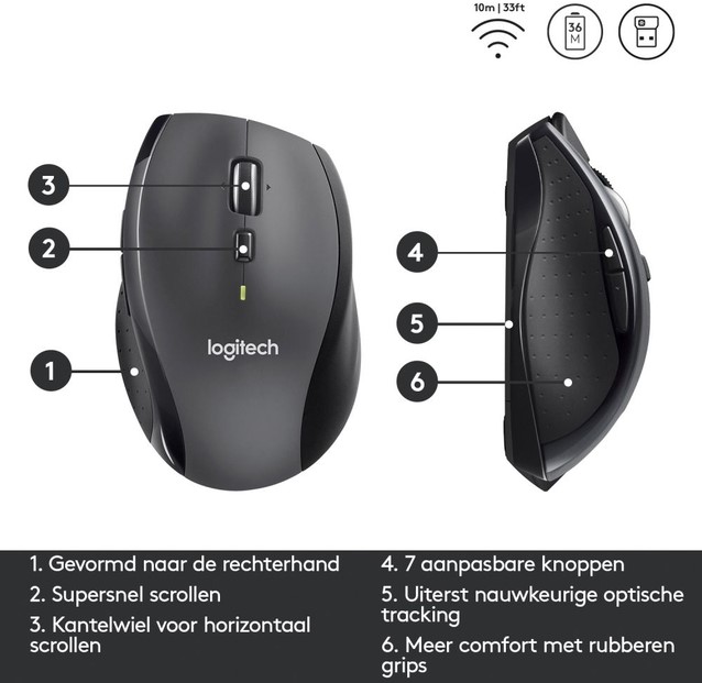 • De Logitech M705 Marathon is de draadloze muis die met gemak jarenlang meegaat – letterlijk. Dankzij een indrukwekkende batterijduur tot wel drie jaar werk je zorgeloos door zonder onderbrekingen (