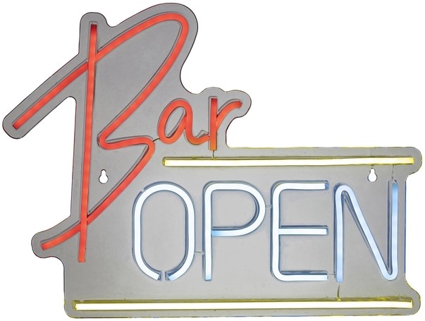 • Neon ledbord met de tekst: Bar Open. Een kleurrijk spel van licht dat levendigheid en sfeer brengt in elke kamer. Deze Lumineo Neon is ontworpen voor binnengebruik en werkt op batterijen, met prioriteit voor flexibiliteit en gemak. De verlichting, met 220 kleine SMD LED's, straalt een speels palet van meerdere kleuren uit en zorgt voor een opvallende, stijlvolle uitstraling. Dankzij het lichte plastic en het wit aansluitsnoer past deze decoratie moeiteloos in diverse interieurs, terwijl de eenvoudige bediening direct comfort en plezier biedt. USB aansluiting