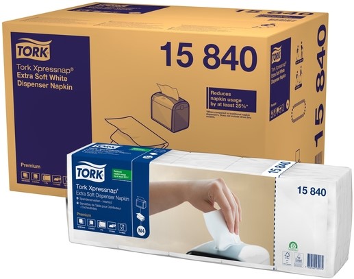 • Tork Xpressnap® Extra Zachte Dispenserservet Wit N4: Drukbezochte zelfbedieningsruimten vragen om hoogwaardige papieren servetten die geen onnodige kosten en afval creëren. Onze Xpressnap® Extra Zachte Dispenserservetten zijn zacht en dik en maken een blijvende indruk op gasten. Ze zijn te gebruiken met al onze Xpressnap® dispensers, die de hygiëne verbeteren omdat gasten alleen hun eigen servet aanraken. De één-per-keer-dosering bespaart bovendien kosten, doordat 25% minder servetten wordt verbruikt dan met traditionele servettendispensers. De voordelen op een rijtje: