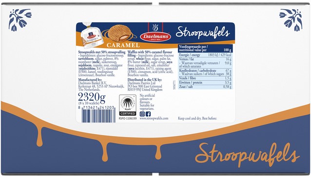 De lekkerste stroopwafels zijn van Daelmans! Deze stroopwafels zijn gevuld met een zachte roomboter stroopvulling verrijkt met Bourbon vanille. Pure verwennerij op ieder moment van de dag. Zeker bij een kop koffie of thee. Warm it up on your cup! De toefzak bevat 10 stroopwafels met een doorsnede van 8 cm. Verkrijgbaar in omdozen à 8 stuks.