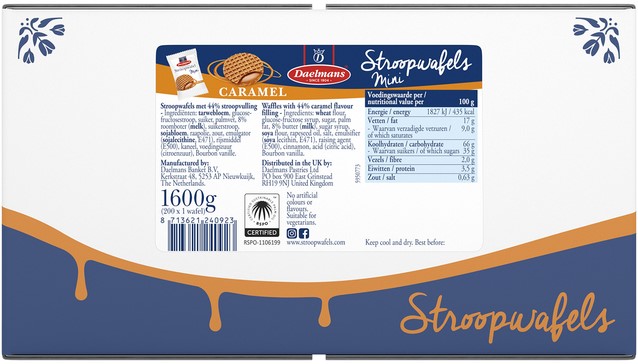 Daelmans Stroopwafels Mini Single Pack. Een verrassende combinatie van een knapperig koekje met zoete stroop maakt Daelmans Stroopwafels het perfecte genietmoment dat altijd, overal en bij iedereen in de smaak valt. Ongeacht het moment van de dag, het is altijd een goed moment voor een Daelmans Stroopwafel. Eenpersoonsverpakking met 1 Karamel Mini Stroopwafel. Een handige kleinverpakking, perfect om uit te delen! - Knapperige stroopwafel met 44% stroopvulling.