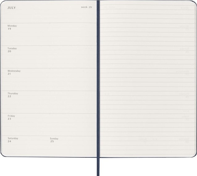 De Moleskine Weekly Notebook Planner is gedateerd van januari tot december. Het is een handige en veelzijdige planner die de vrijheid van een notitieboekje bevat en is ingedeeld met de afspraken van de week aan de linkerkant en een gelinieerde pagina voor notities op de rechter bladzijde. Het notitieboekje is beschikbaar met een harde of een zachte kaft met afgeronde hoeken en een elastische sluiting. - Harde of Zachte kaft - Afgeronde hoeken - Elastische sluiting - Moleskine ivoorkleurig papier - Papiergewicht: 70 g/m² - Handige tools: planning, tijdzones, internationale metingen, toegangscodes en vluchtduur - Uitbreidbaar binnenvak passend bij de kleur van het notebook - "In geval van verlies" label gedrukt op het schutblad - Bijpassende bladwijzer voor lint - Herbruikbare paperband B-SIDE met extra gedrukte tools - 180° liggende opening - Moleskine srl. creëert en verkoopt FSC-gecertificeerde producten