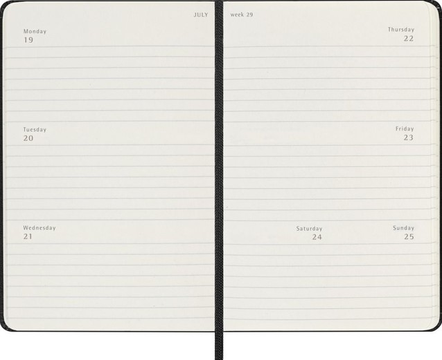 De Moleskine Horizontal Weekly Planner is gedateerd van januari tot december. Deze populaire planner is ingedeeld in een horizontaal formaat om elke week op twee pagina's te laten zien (maandag t/m woensdag aan de linkerkant, donderdag t/m zondag aan de rechterkant). De planner heeft afgeronde hoeken en een elastische sluiting. Gevuld met prachtige, ivoorkleurige pagina's, met genoeg ruimte voor uw eigen inbreng evenals handige tools. - Harde of Zachte kaft - Afgeronde hoeken - Elastische sluiting - Moleskine ivoorkleurig papier - Papiergewicht: 70 g/m² - Handige tools: planning, tijdzones, internationale metingen, toegangscodes en vluchtduur - Wereldwijde feestdagenkalender verkrijgbaar via moleskine.com/diaryaddons - Uitbreidbaar binnenvak passend bij de kleur van het notebook - "In geval van verlies" label gedrukt op het schutblad - Bijpassende bladwijzer voor lint - Herbruikbare paperband B-SIDE met extra gedrukte tools - 180° liggende opening - Moleskine srl. creëert en verkoopt FSC-gecertificeerde producten