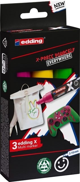 Hé, trendsetter! Klaar om je creatieve spel te verbeteren? Maak kennis met de edding X Multi Marker - de ultieme sidekick voor tieners die durven te dromen in kleur. Stel je een marker voor die delig is van tovenaar tot rockster. Dat is onze beitelpunt! Hij danst met gemak over oppervlakken zoals canvas, sneakers en T-shirts. Dikke streken, dunne lijnen, zigzaggende lijnen - het is aan jou. En die kleuren? Ze zijn als een regenboogexplosie op een eenhoornfeestje. Maar wacht, er is meer! Onze inkt is als een trouwe BFF. Het zal je niet vergeten, vervagen of afbladderen. Dus ga je gang, customize je kicks, zet krabbels op je telefoonhoesje en verander dat effen T-shirt in draagbare kunst. Jij bent de kunstenaar en deze acrylverfstift is jouw toverstaf. En raad eens? We zijn nog milieuvriendelijk ook! De dop en houder zijn gerecyclede champs en onze inkt is 100% veganistisch. Dus druk jezelf vrijmoedig uit in de wetenschap dat je de planeet één streek per keer redt. Met liefde en een vleugje rebelse geest gemaakt in Duitsland. Maak je klaar om te creëren, inspireren en slay.