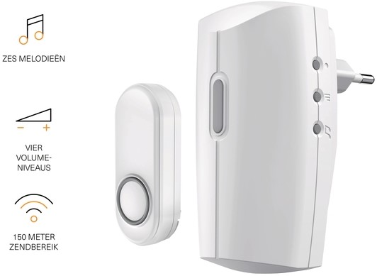 • Stekkerdeurbelset KlikAanKlikUit ACDB-8000AC Met deze draadloze stekkerdeurbelset zorg jij ervoor dat je nooit meer een bezoeker mist. Je plaatst de plug-in deurbel eenvoudig in elk gewenst stopcontact in huis, terwijl je de waterdichte drukknop bij de voordeur, garage of schuur bevestigt. Zo hoor jij overal direct wanneer er wordt aangebeld. De installatie is verrassend eenvoudig. Je steekt de deurbel in het stopcontact, koppelt de drukknop met één druk op de knop en het systeem is direct klaar voor gebruik. Geen ingewikkelde bedrading, maar direct gemak en betrouwbaarheid. Je kiest uit zes verschillende melodieën en stelt eenvoudig het volume in naar jouw voorkeur. Of je nu een subtiele melding wilt of een duidelijk hoorbare bel, jij bepaalt hoe je gewaarschuwd wordt. Dankzij de flexibele plaatsing gebruik je deze deurbel precies waar jij hem nodig hebt. Met deze slimme oplossing combineer jij gebruiksgemak, flexibiliteit en zekerheid in één compacte deurbelset. Ideaal voor elk huishouden waar comfort en betrouwbaarheid voorop staan. Kenmerken: